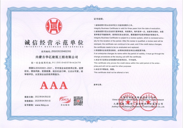 内蒙古华亿建筑工程有限公司本着“诚信铸基,品质筑臻 ”的经营理念,秉承“勇于开拓、真抓实干、锐意进取、创造精品”的经营宗旨,完成了各类房屋建筑工程,市政工程,道路改造及园林绿化工程。近年来被评为“内蒙古自治区建筑业优秀企业”、“内蒙古自治区建筑业AAA级信用企业”、“诚信经营示范单位”,所承建“万锦滨河国际”项目被评为国家级“安全文明标准化工地”。