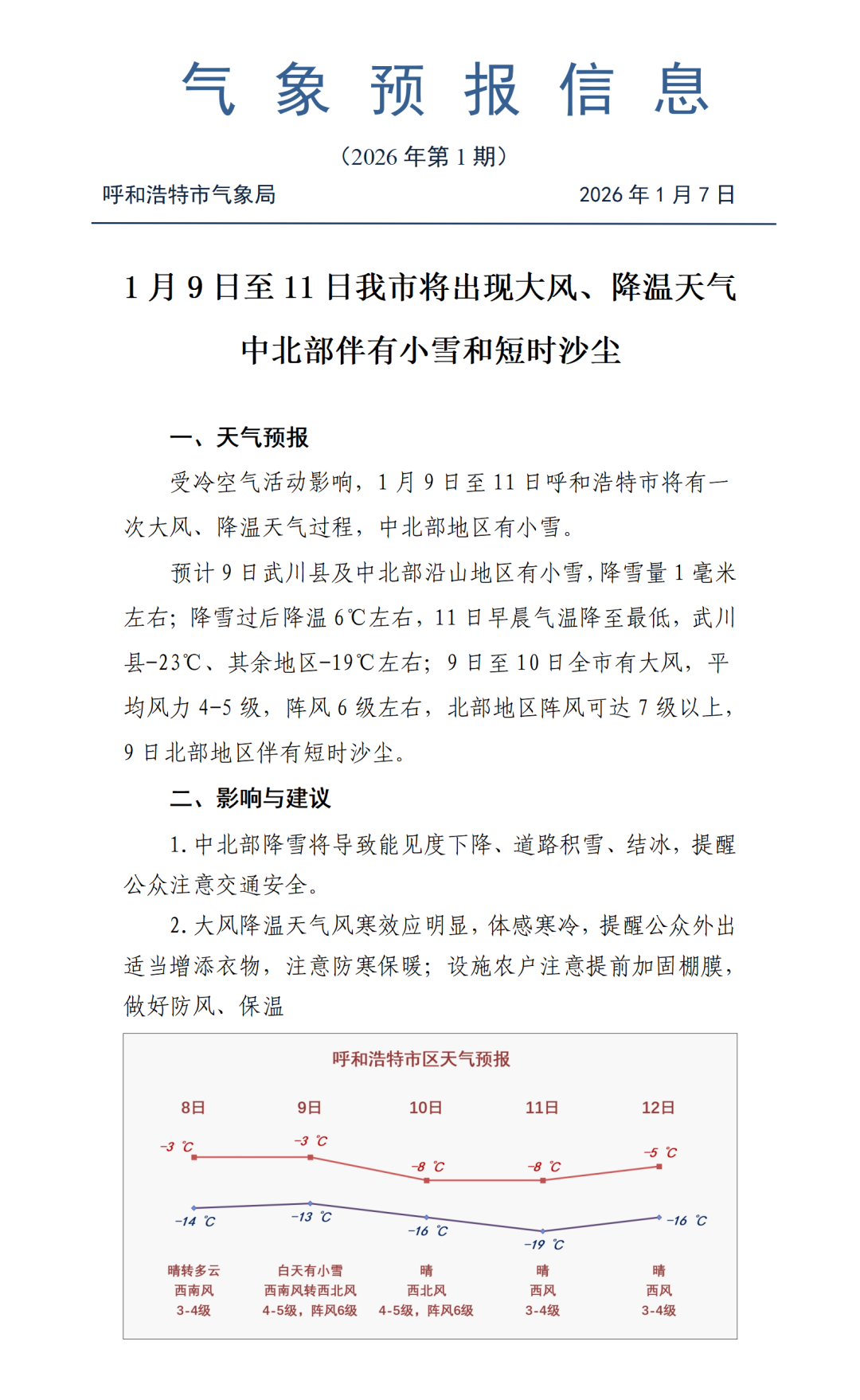 据呼和浩特市气象局消息:受冷空气活动影响,1月9日至11日呼和浩特市将有一次大风、降温天气过程,中北部地区有小雪。