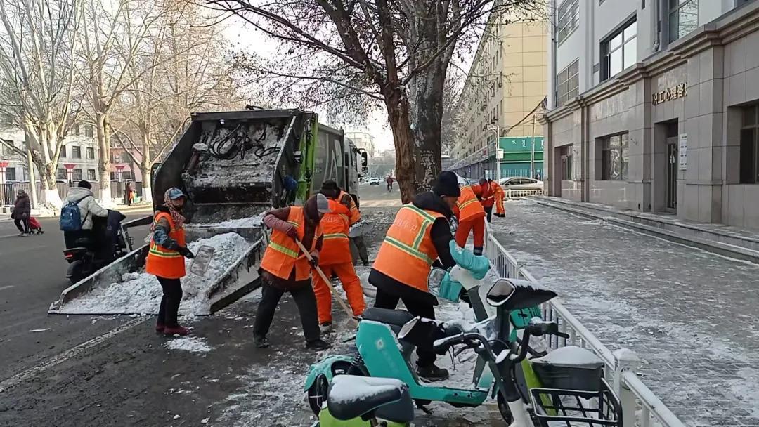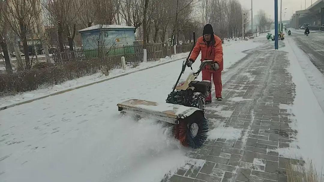 对于机械无法覆盖的人行便道、公交站台、小区出入口及背街小巷,2400余名环卫工人顶风冒雪,手持推雪板、铁锹、扫帚等工具,对新积雪和残冰进行集中清理。重点对学校周边、医院门前、农贸市场等人流密集区域开展精细化作业,全力保障市民安全通行。针对部分路段的薄冰区域,则采用“人工铲冰+融雪剂渗透”方式,彻底消除隐患。