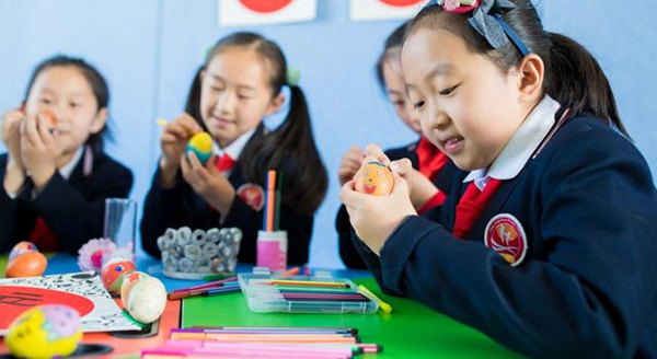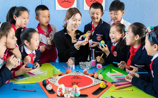 2019年5月5日,呼和浩特市玉泉区恒昌店巷小学的孩子们在绘彩蛋。