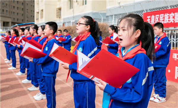 2021年3月29日,呼和浩特市玉泉区民族实验小学学生在“从小学党史 童心永向党”主题教育活动上演唱歌曲。