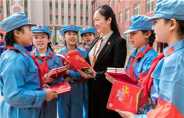 2021年3月29日,内蒙古呼和浩特市玉泉区民族实验小学“小小先锋宣讲员”在和老师交流党史学习心得体会。
