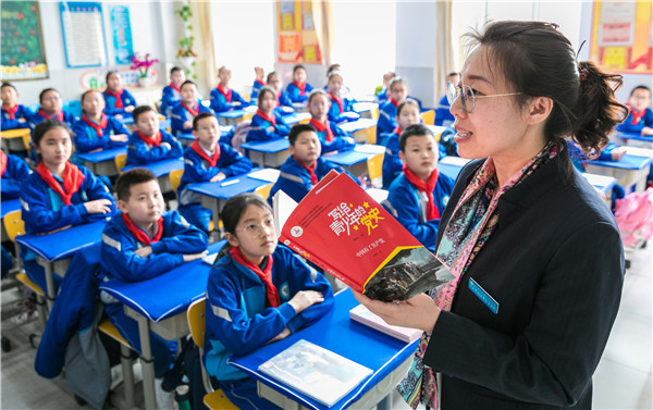 2021年3月29日,内蒙古呼和浩特市玉泉区民族实验小学老师在向学生普及党史知识。