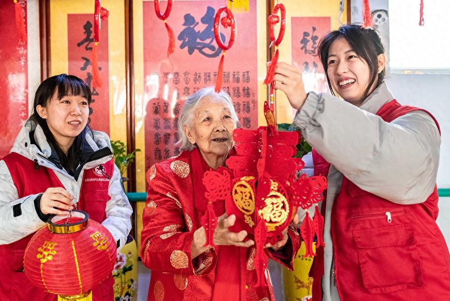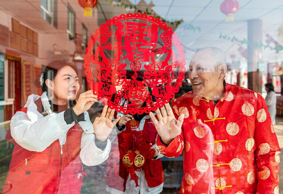 志愿者和老人在呼和浩特市玉泉区玉泉区夕阳红老年康乐园内张贴迎新春饰品。丁根厚 摄