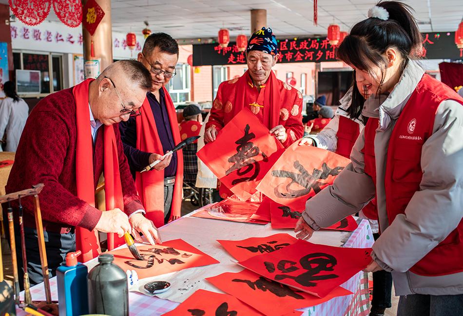 志愿者在呼和浩特市玉泉区民政局“福至养老院 情暖夕阳红”迎新春活动为老人书写中国“福”和寿字 。丁根厚 摄