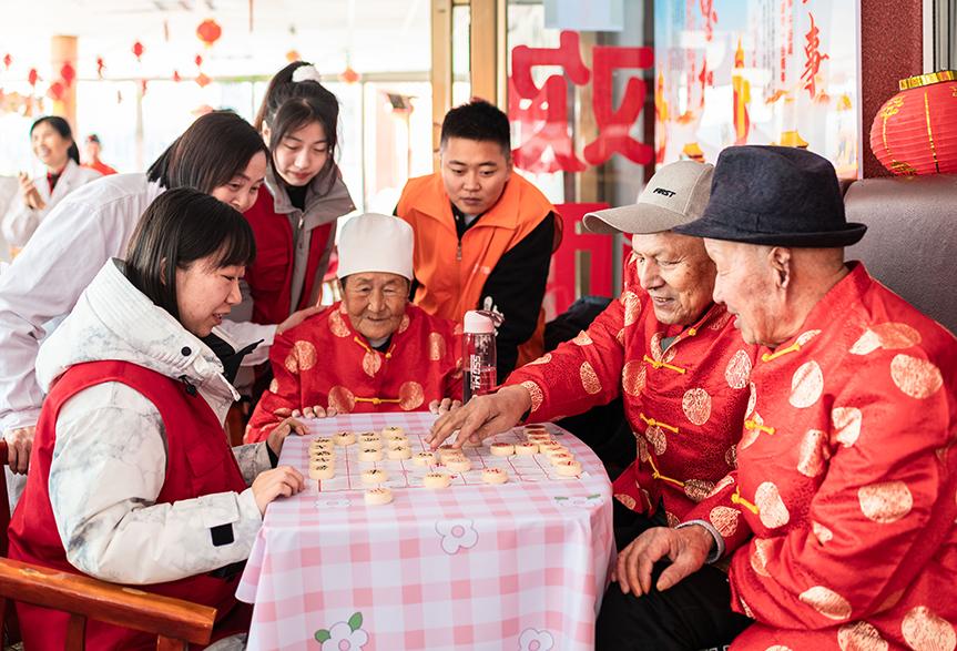 志愿者在呼和浩特市玉泉区民政局“福至养老院 情暖夕阳红”迎新春活动现场陪伴老人们下象棋。丁根厚 摄