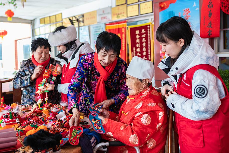 志愿者在呼和浩特市玉泉区民政局“福至养老院 情暖夕阳红”迎新春活动现场为老人展示刺绣鞋垫 。丁根厚 摄