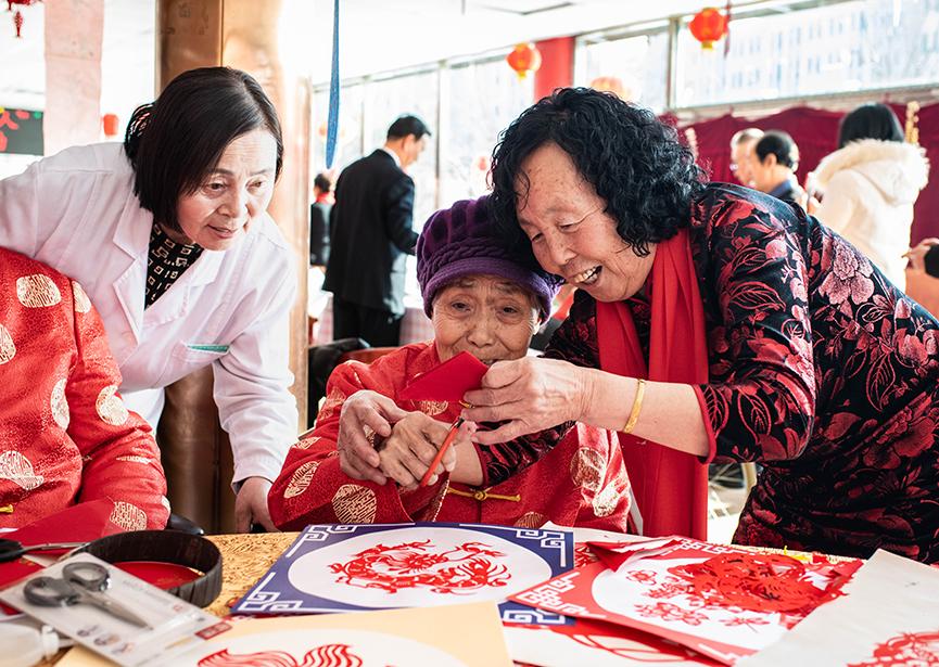 志愿者和老人在呼和浩特市玉泉区民政局“福至养老院 情暖夕阳红”迎新春活动现场剪窗花 。丁根厚 摄