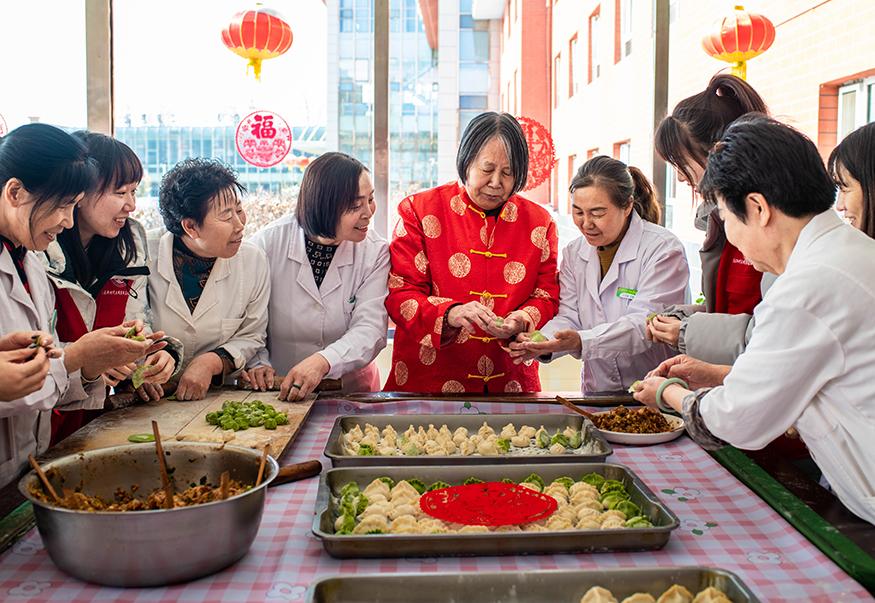 志愿者和老人在呼和浩特市玉泉区民政局“福至养老院 情暖夕阳红”迎新春活动现场包饺子 。丁根厚 摄