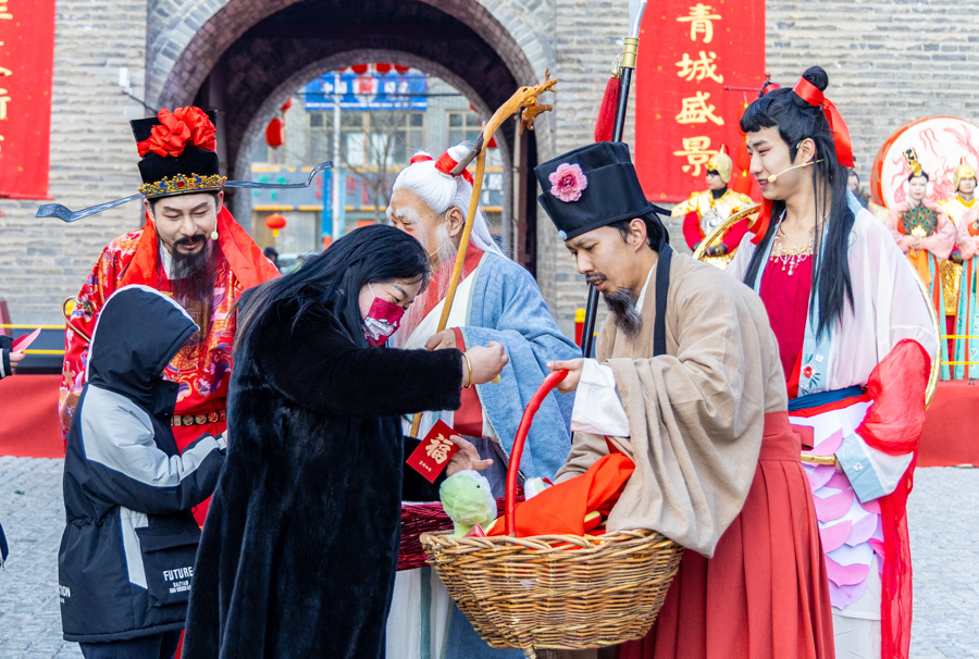 2月12日,民间艺人在呼和浩特新春文化庙会戏曲非遗“闹元宵”活动现场与游客互动。丁根厚 摄
