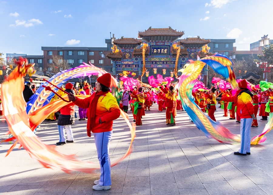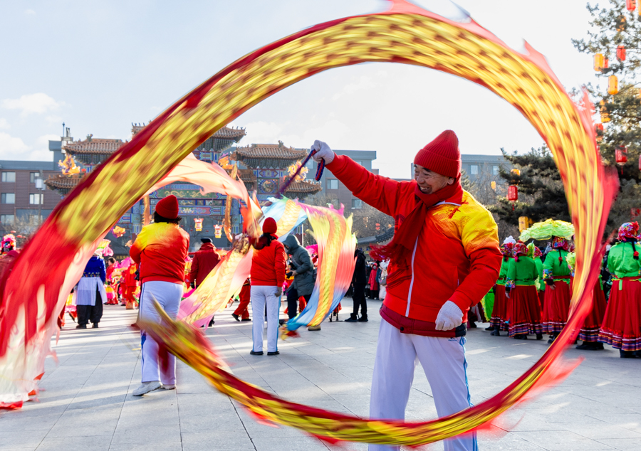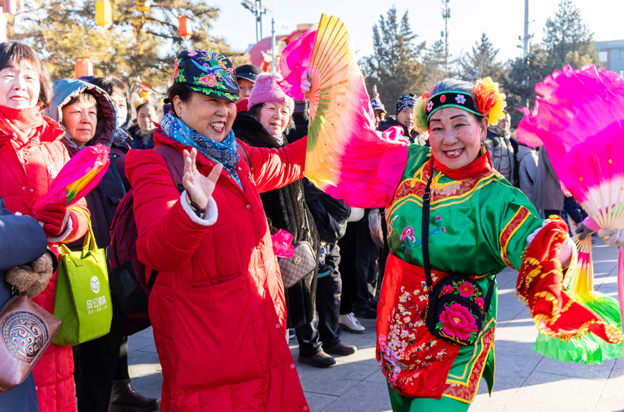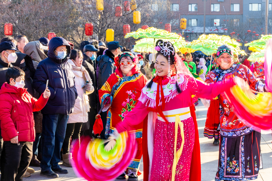 2月12日,民间艺人在呼和浩特新春文化庙会戏曲非遗“闹元宵”活动现场表演秧歌。丁根厚 摄