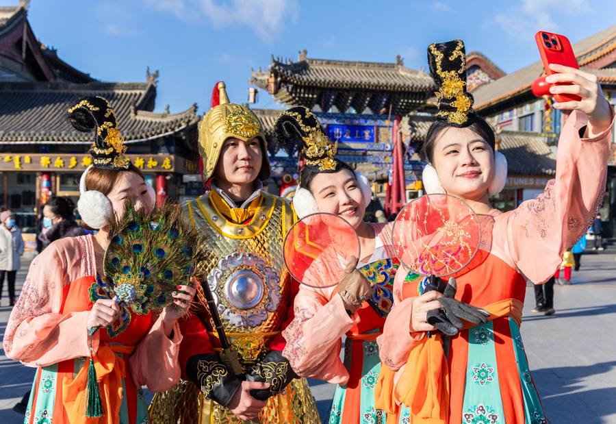 2月12日,游客在呼和浩特新春文化庙会戏曲非遗“闹元宵”活动现场与国潮演员留影。丁根厚 摄