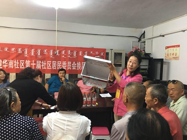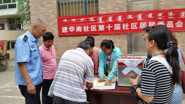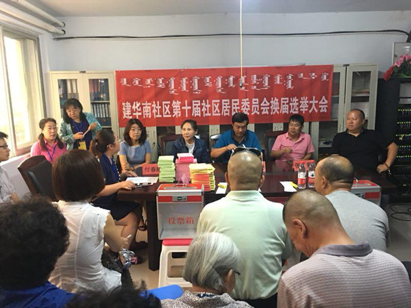 2018年8月17日上午9点整,建华南社区在会议室召开第十届居委会换届选举大会。大会设主会场一处和3个投票站,分别为建华南居委会,聚鑫园东门和电力二区。来到社区观摩和指导居委会换届选举工作的领导有:小召前街街道党工委书记马晓,小召前街街道党工委副书记张毅,小召前街街道纪工委书记孙雪琴,小召前街街道副主任付春际。
