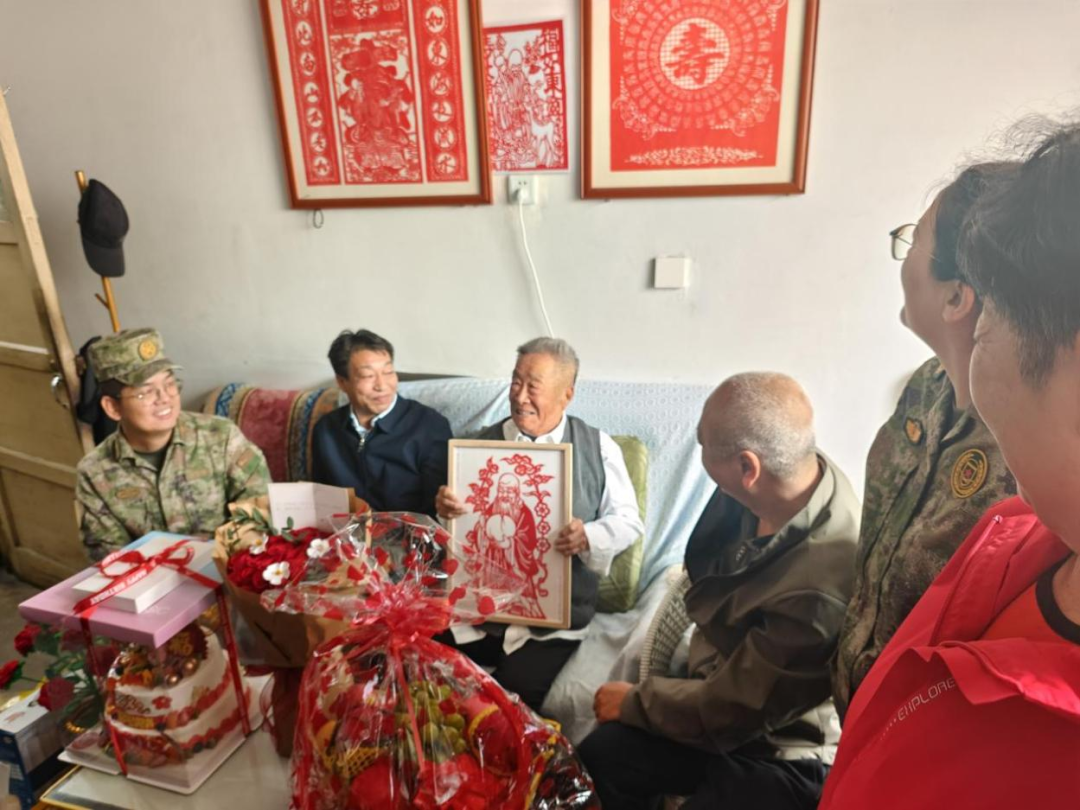 2025年是抗日战争暨世界反法西斯战争胜利80周年,为进一步弘扬伟大抗战精神、传承红色基因,营造拥军优属、尊老爱老的浓厚氛围。10月10日,由区人民武装部、区退役军人事务局、街道党工委书记、街道人民武装部部长及华宇社区党委书记等一行人共同走进抗美援朝功勋老兵高忠久家中,为这位历经战火洗礼的百岁老人举办了一场简朴而隆重的生日庆祝活动。