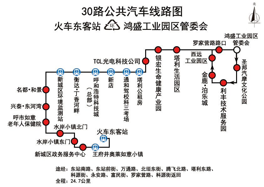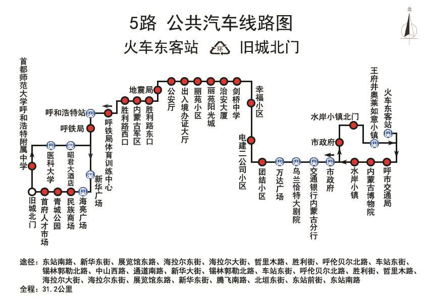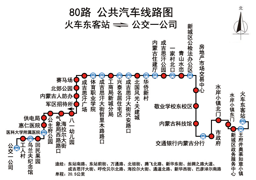 调整后取消:中交•上东国际、海拉尔东街站、呼和浩特汽车客运中心,共3站;原水岸小镇、内蒙古博物院、呼市交通局调整为单向路北停靠。调整后新增:王府井奥莱如意小镇、水岸小镇北门,共2站,路南单向停靠。