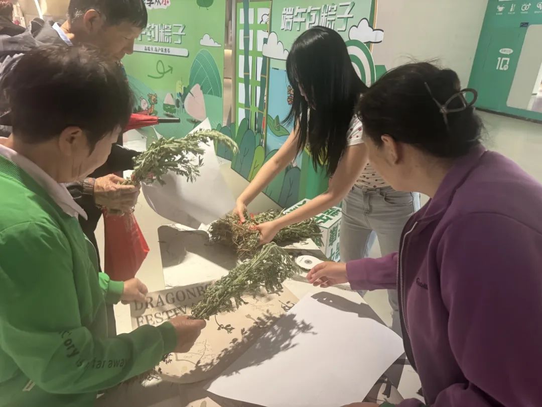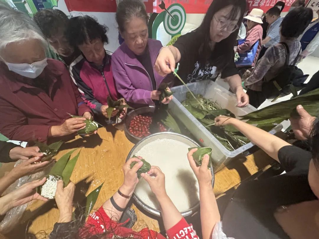 活动伊始,居民在工作人员指导下亲手制作艾草花束,将驱蚊祈福的千年习俗化为清新雅致的手作,为家居增添自然意趣。随后,大家围坐编织象征平安吉祥的五彩绳,体验指尖艺术的古老寓意。在包粽子区域,居民化身“包粽能手”,伴随糯米与红枣的香甜气息,将承载团圆寓意的粽子精心包裹成型。趣味游戏“钓粽子大作战”中,参与者手持钓竿专注挑战,欢笑声此起彼伏,巧妙融合传统与竞技乐趣。六一甜品站前,云朵般的棉花糖吸引孩童驻足,甜蜜滋味点亮节日氛围。