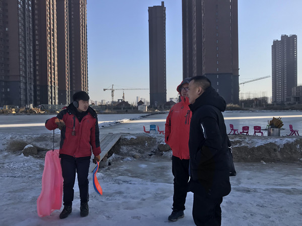 注:图为玉泉区旅游局执法人员询问冰雪场运营情况。