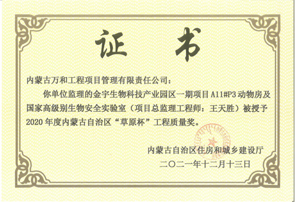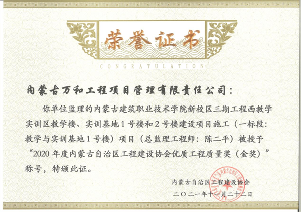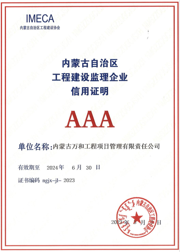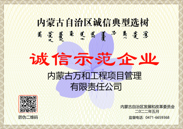诚信经营是企业发展之魂。企业的自身诚信水平、诚信建设不仅关系到企业当前的效益,更关系到企业的高质量发展。内蒙古万和工程项目管理有限责任公司连续多年被内蒙古工商局授予“重合同、守信用”单位及“诚信单位”,是自治区唯一被评为“中国建设监理创新发展20周年工程监理先进企业”的单位,2009年以来,连续每年都被评为“优秀建设监理企业”,2021年公司获批国家“高新技术企业”。