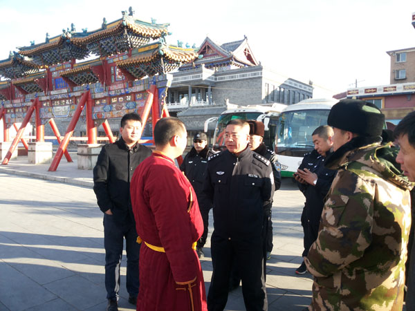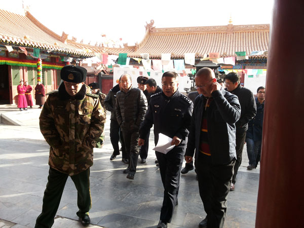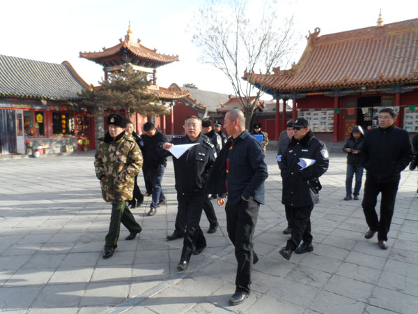 为全力确保春节除夕夜寺院敬香祈福活动的平安进行,防止失火、踩踏等安全事故的发生,2015年1月26日下午,玉泉区政府副区长、公安分局党委书记、局长许金刚,玉泉区公安分局党委副书记、玉泉区副调研员胡少戡、政委王佳文、玉泉区民族宗教事务局局长张语、玉泉区消防大队教导员凌波等领导对辖区大召寺、席力图召、财神庙、傲塔奇召、观音庙、宝尔罕佛塔、五塔寺等寺院及周边进行了安全检查,并就安全保卫工作提前进行了全面部署。