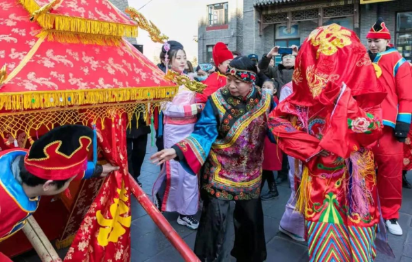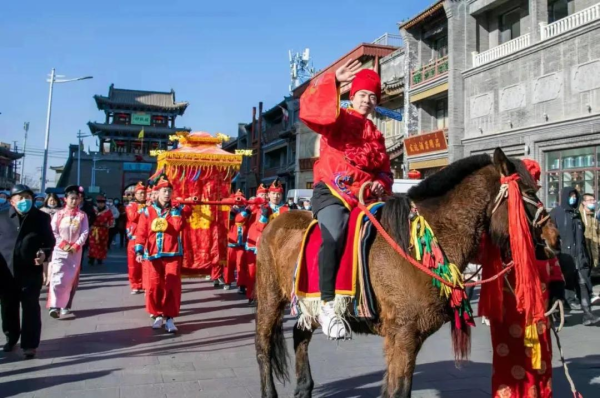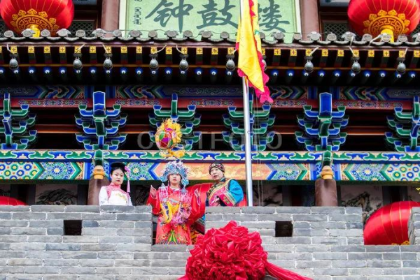 2021年2月17日,演员在内蒙古呼和浩特市玉泉区塞上老街表演绣楼招婿。