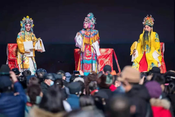2021年2月17日,演员在内蒙古呼和浩特市玉泉区大召广场表演晋剧《打金枝》选段。
