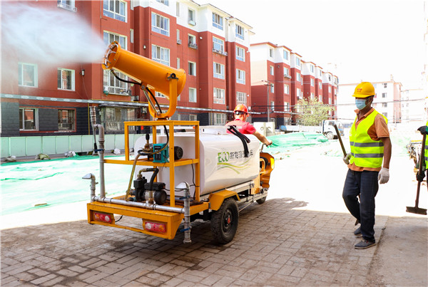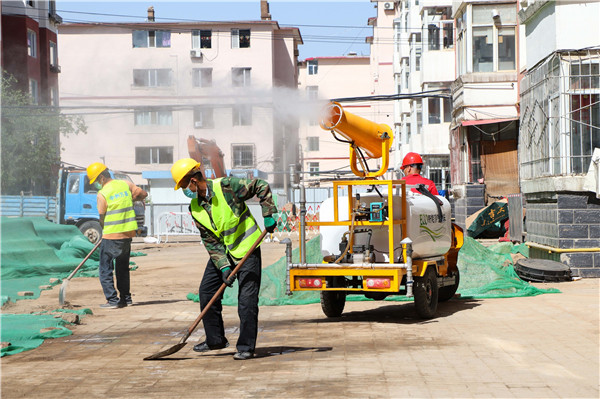 记者在施工现场看到,小区之前长期存在的临建、凉房、私搭乱建小院、围墙已经被拆除,工人师傅正在紧张地进行施工作业,裸露土地用绿网苫盖,雾炮车同步进行降尘处理。