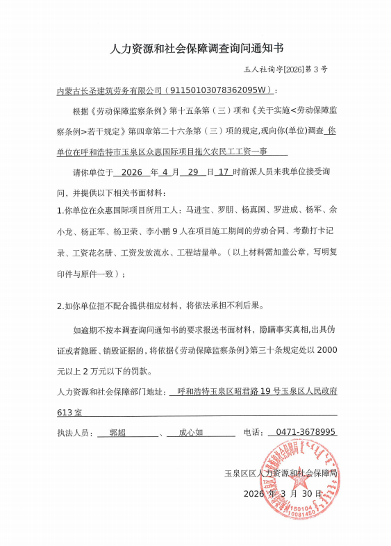 我局依法查处你公司在玉泉区众恵国际拖欠农民工工资一案,我局执法人员多次电话联系公司法定代表人,均无人接听。我局于2026年3月25日向你公司邮寄《人力资源和社会保障调查询问通知书》(玉人社询字【2026】第3号),邮件无法送达被退回。因我局无法以直接或邮寄等其他方式向你公司送达,依照《中华人民共和国民事诉讼法》第九十五条规定,现采用公告送达方式向你公司送达《人力资源和社会保障调查询问通知书》(玉人社询字【2026】第3号),自公告发布之日起经过三十日,即视为送达。