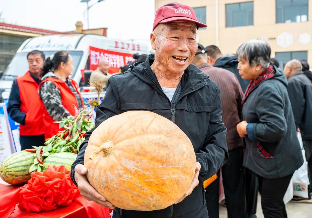 呼和浩特市玉泉区“中国农民丰收节”活动现场,村民展示收获的大南瓜。丁根厚 摄