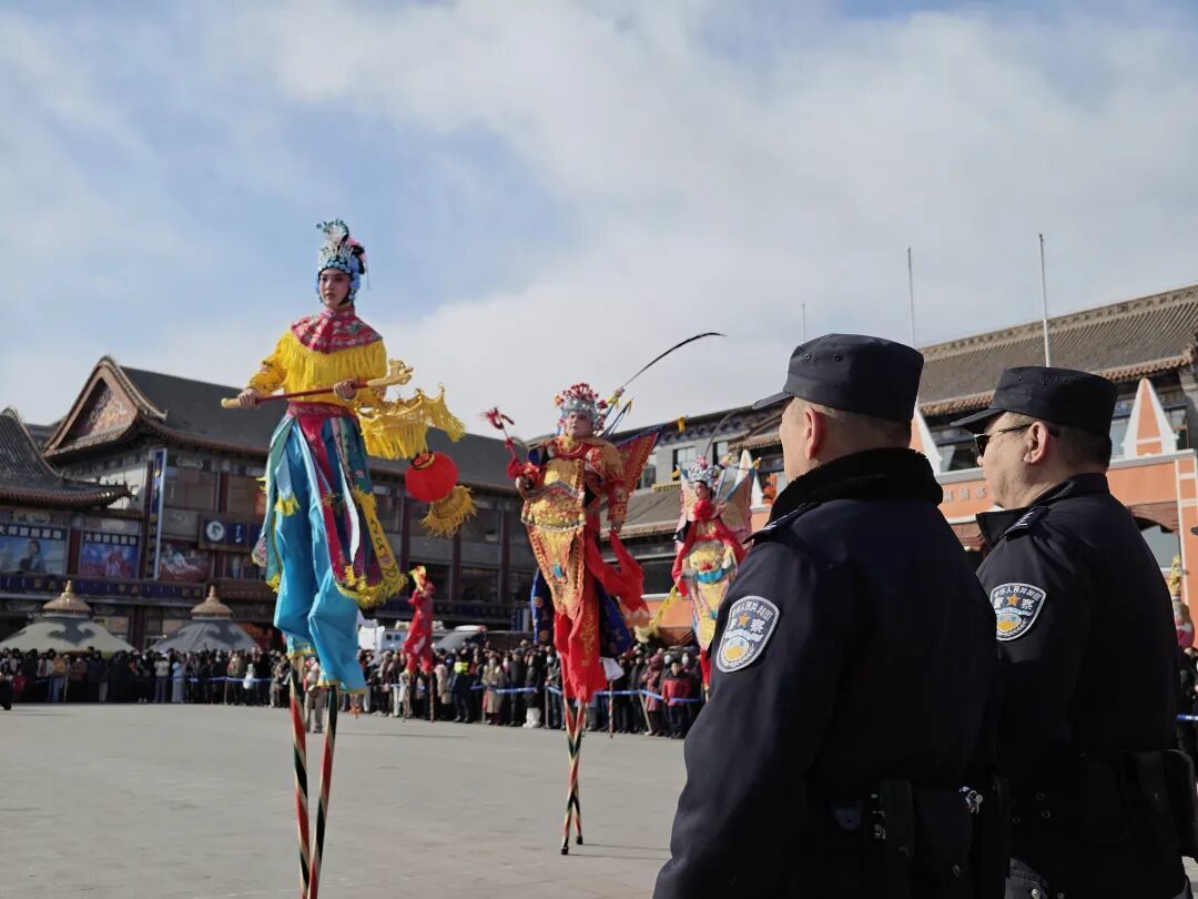9时,非遗展演正式开始,秧歌队伍踏着鼓点穿梭广场,非遗手工艺品摊位前人头攒动,游客争相打卡拍照,广场上洋溢着欢乐祥和的节日氛围。民警辅警的工作,也进入了忙碌的时刻。