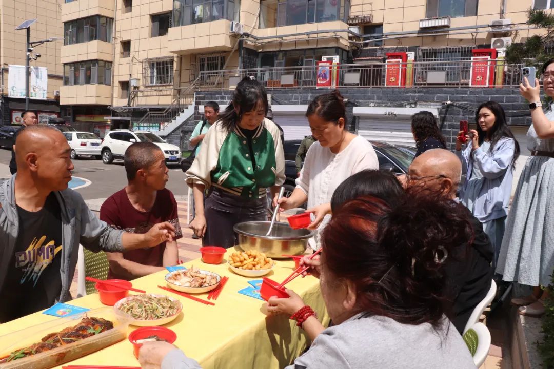 每一道菜肴都饱含着浓浓的“家”的味道。居民们围坐共餐,一边品尝美味佳肴,一边交流烹饪心得、分享生活见闻、畅谈邻里趣事。现场气氛热闹而温馨,洋溢着和谐与欢乐,进一步增进了邻里间的了解与友谊。