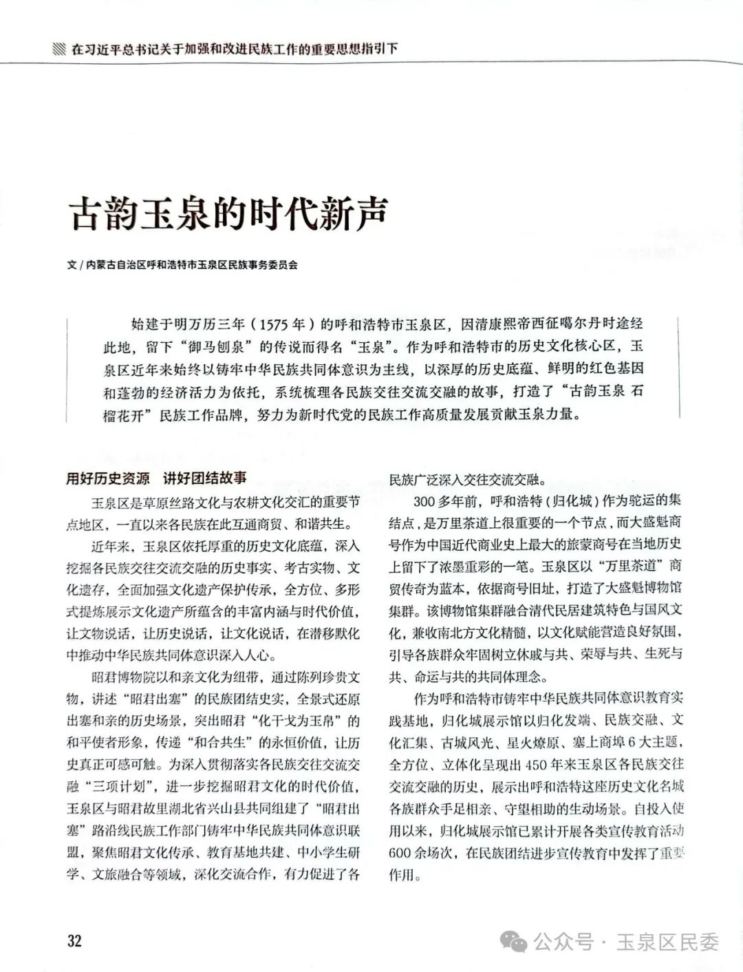 近日,《中国民族》杂志刊发了我区《古韵玉泉的时代新声》文章,该文章由玉泉区民族事务委员会供稿,在2025年第6期刊发。