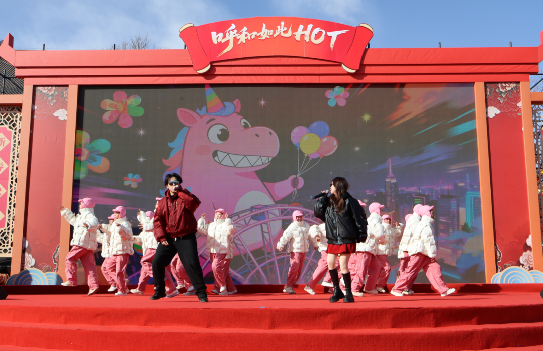 上午九时许,塞上老街旅游休闲街区已是人头攒动、欢声如潮。活动在“非遗社火奏春歌”中火热开场,扭秧歌、踩高跷等传统社火与呼和浩特欢乐冰雪节的仙侠NPC同框巡游,让年味迅速蔓延。随后的启动仪式文艺演出精彩纷呈,群口相声、马舞、二人台新联唱、晋剧戏歌等十余个节目轮番登场,著名歌手蒙克倾情助阵,深度融合本土风情与马年元素,带来沉浸式新春体验。