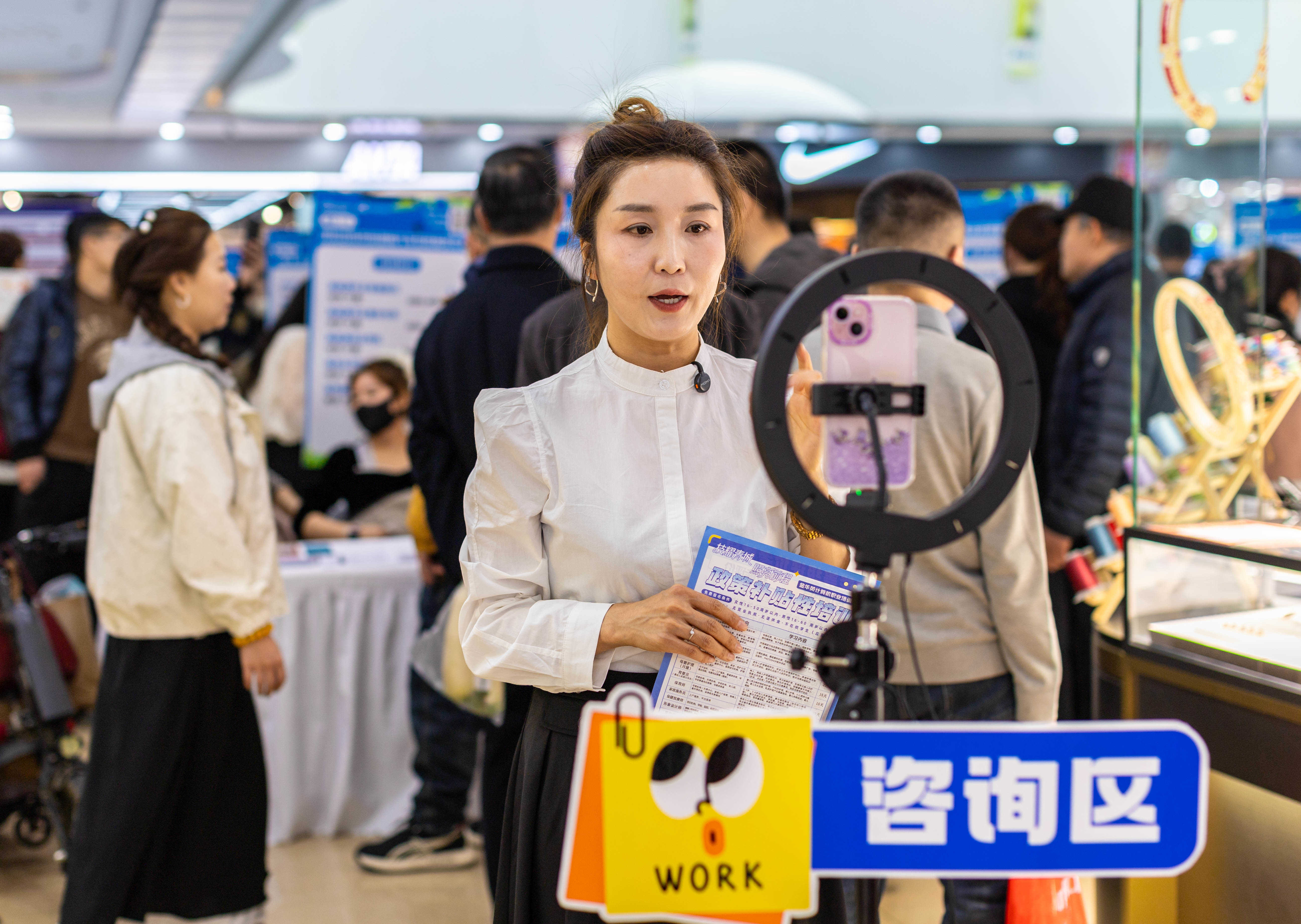 2026年3月28日,呼和浩特市玉泉区“春风行动”暨就业援助季专场招聘会现场,工作人员通过直播介绍国家补贴性培训相关内容。丁根厚 摄