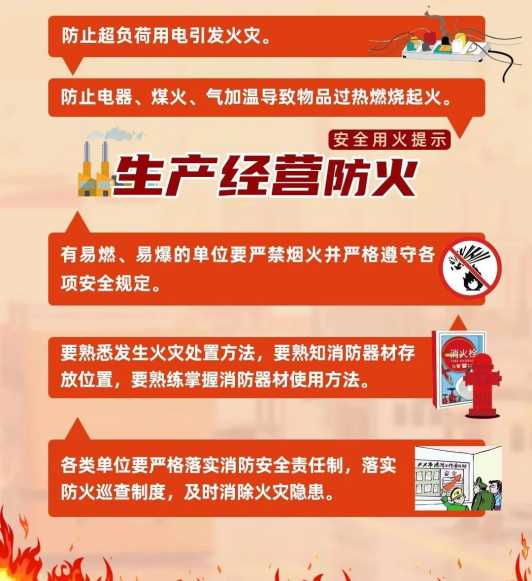 秋季来临天气逐渐变得干燥,用电、用气、用火现象明显增多,若操作不慎或使用不当,极易发生火灾事故,让我们一起学习秋季防火“四不要”吧。一不要:生活用火不可以掉以轻心。进入秋季家庭日常做饭、取暖、照明等用火次数增多,各类取暖设施使用频率较高,稍有不慎就会引发火灾,一旦燃烧失控很容易造成灾难,甚至发展成“火烧连营”的态势。二不要:不使用“带病”的电器家具。家用电器出现故障一定要及时维修,千万不要让电器“带病”工作。三不要:不要随意吸烟,注意安全隐患。如大风天室外吸烟乱扔烟头或在床上吸烟很容易引发火灾。四不要:不要在单元楼内堆放废弃物或停放车辆,保持消防通道畅通,不要在家里存放易燃易爆等危险物品。安全用火提示↓↓↓