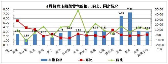 6月份,在监测的15种蔬菜平均零售价格为3.05元/斤,月环比微涨0.33%。15种蔬菜中有9个品种价格下降,6个品种价格上涨。其中芹菜、大白菜、油菜价格月环比涨幅较明显,分别上涨27.41%、13.93%、10.05%,其它蔬菜平均零售价格呈小幅波动。