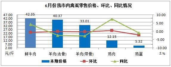 与去年同期相比,牛肉、鸡肉平均零售价格分别上涨4.26%、7.52%,羊肉(去骨)、羊肉(带骨)、鸡蛋平均零售价格分别下降2.42%、2.65%、0.93% 。