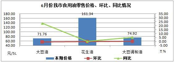 6月份,桶装大豆油、桶装花生油平均零售价格为71.76元/桶(5L)、161.34元/桶(5L),月环比分别下降0.54%、0.17%,桶装调和油平均零售价格为74.92元/桶(5L),月环比微涨0.23%。