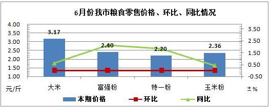 6月份,大米、富强粉、特一粉、玉米粉平均零售价格分别为3.17元/斤、2.40元/斤、2.20元/斤、2.36元/斤,月环比持平。