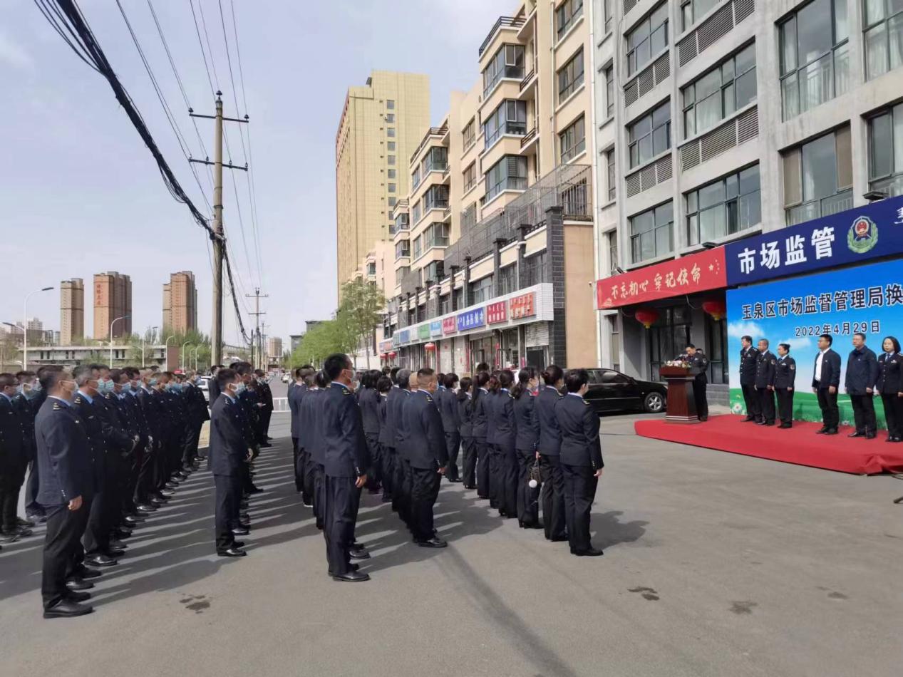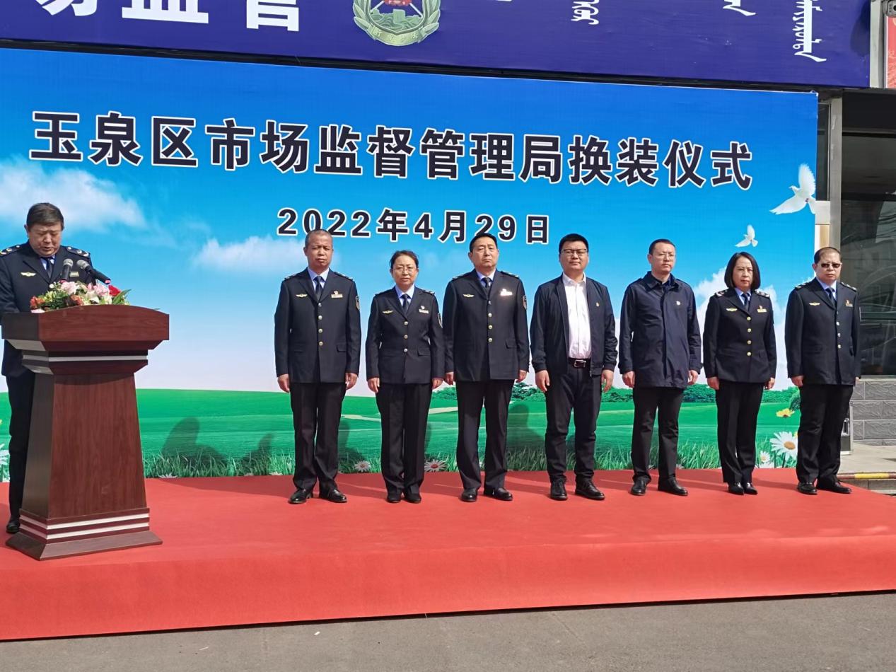 2022年4月29日10时,呼和浩特市玉泉区市场监督管理局举行新式执法制式服装换装仪式。169名干部职工身着新式执法制服,参加换装仪式。