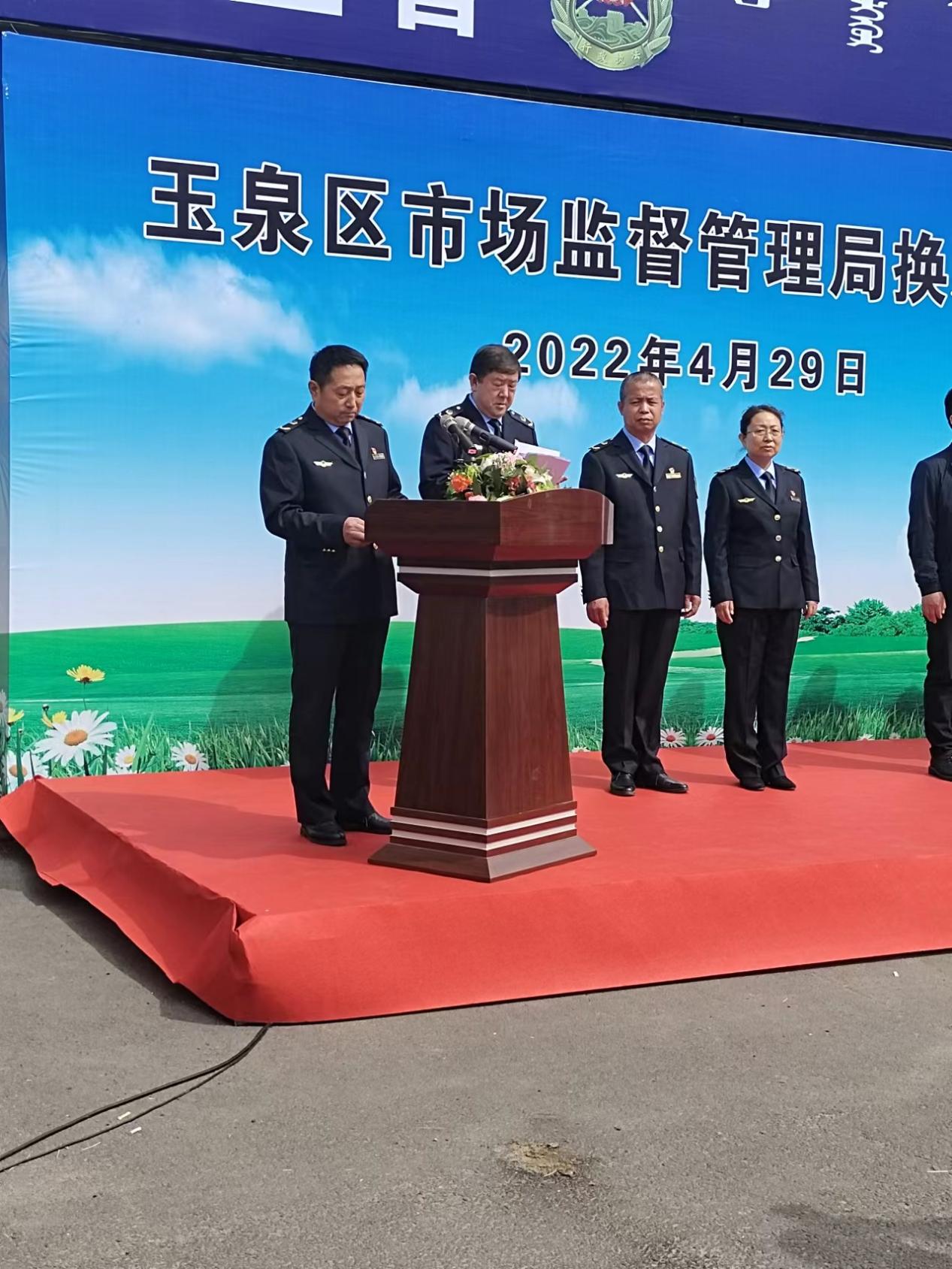 换装仪式在奏唱国歌中开始,由玉泉区市场局张春雷副局长主持换装仪式,玉泉区市场局孟志毅局长致辞,玉泉区政府金磊副区长参加了换装仪式。