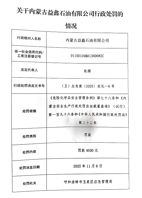 关于内蒙古益鑫石油有限公司行政处罚的情况