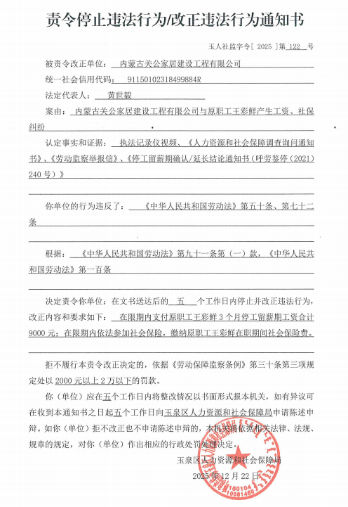 1.《责令停止违法行为/改正违法行为通知书》(玉人社监字令【2025】第122号)