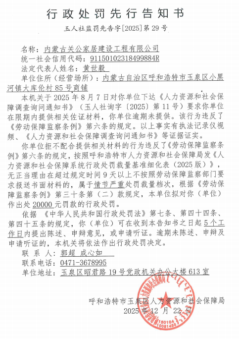 2.《行政处罚先行告知书》(玉人社监罚先告字【2025】第29号)