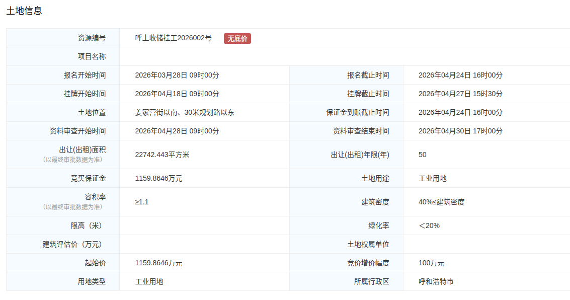 呼和浩特市挂牌出让国有建设用地使用权公告