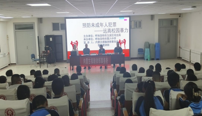 为进一步强化校园法治建设,从源头上预防和减少青少年霸凌案件的发生,推进平安校园建设。近日,玉泉区司法局联合内蒙古祺翰律师事务所,在辖区呼和浩特市第六中学(初中部)举办了一期校园法治讲座,120多名学生聆听了讲座。