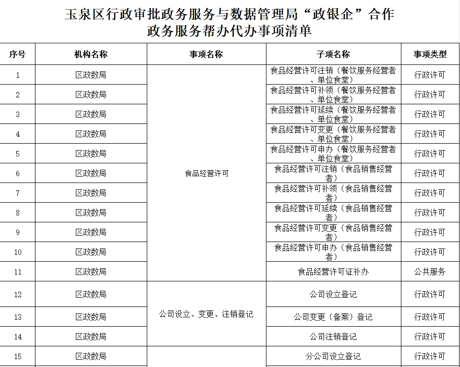 玉泉区行政审批政务服务与数据管理局“政银企”合作网点 办理地址、咨询电话 | |||