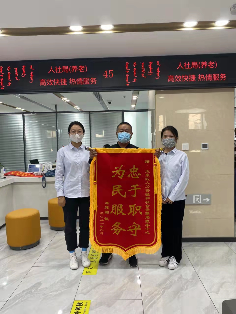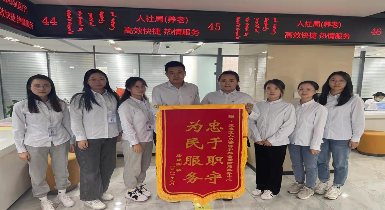 “忠于职守,为民服务”,短短的两行字道出了居民的心声。9月30日下午,一位前来办理业务的大爷为窗口工作人员送来感谢的锦旗,社保窗口已多次收到居民的锦旗和一致的好评。当日为玉泉区社保窗口送上锦旗的是一位身体有残疾的老人,在养老缴费基数还未公布时,这位老人多次跑来询问基数缴纳是否开始,工作人员贾倩看到此情况,便向老人说明情况,并且留下联系方式和相关办理业务的材料,告知基数下发后办理好再通知老人缴费。