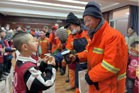 在寒风凛冽的冬日,广大环卫工人不畏严寒、连夜作战,全力保障道路畅通和市民出行安全。看到广大环卫工人严寒,不分昼夜辛苦劳作,五塔前街社区新时代文明实践站联合神墨教育学校,开展“神墨口才为爱发声,温暖在行动”主题活动,活动现场由小朋友们为环卫工人带来口才文艺表演,并送去手套,奶茶等物品,同时还呼吁辖区居民和小朋友们保护环境,关爱环卫工人。